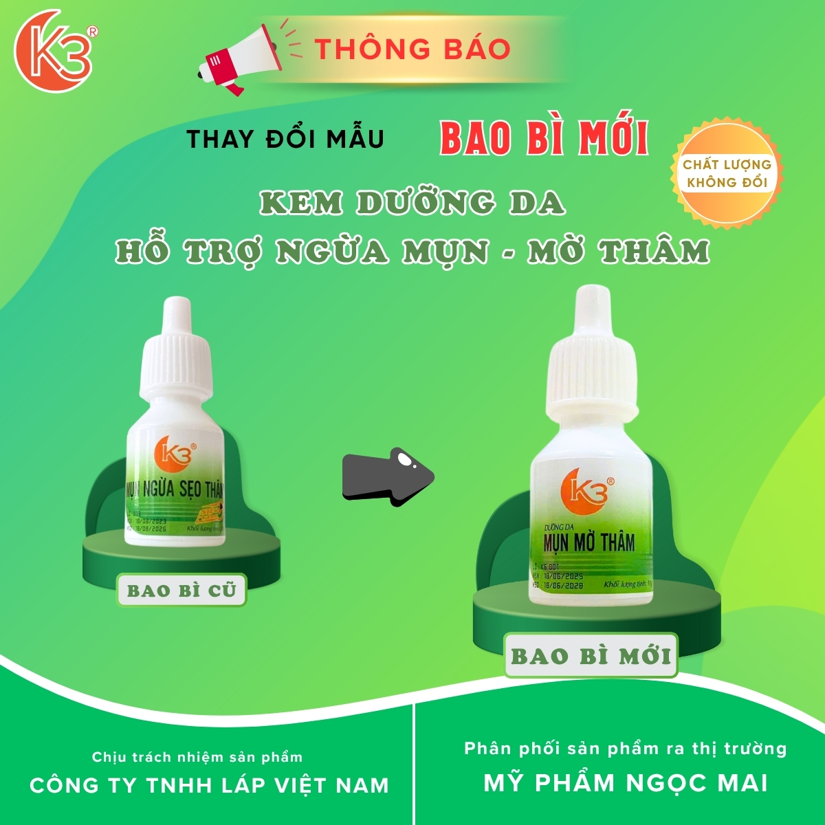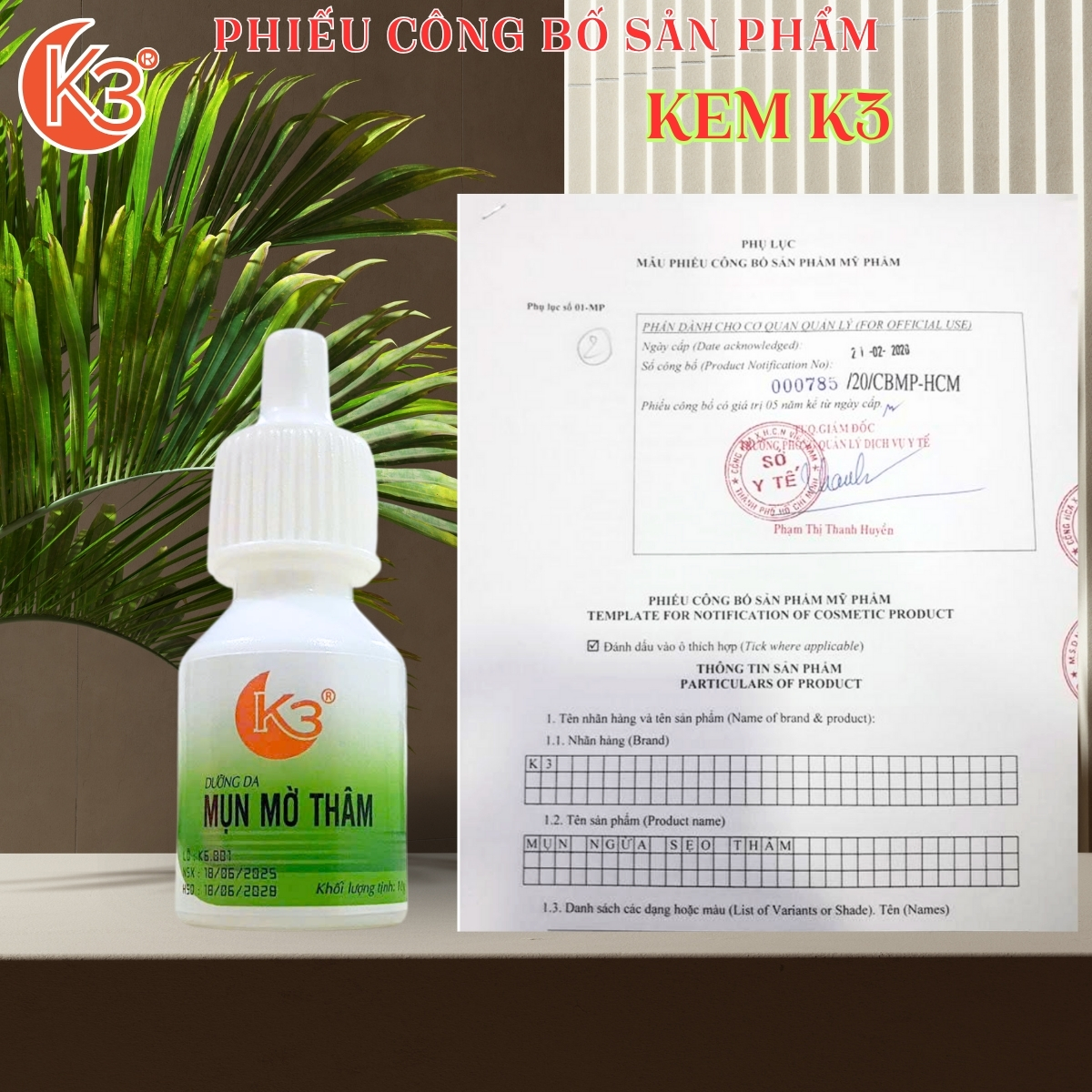 * CAM KẾT TỪ NHÀ BÁN HÀNG - MỸ PHẨM NGỌC MAI: "Chúng tôi cam kết với Quý khách hàng Kem chấm mụn siêu tốc, Ngừa sẹo thâm, Se khít lỗ chân lông K3 của chúng tôi kinh doanh là hàng của công ty, nguồn gốc rõ ràng và được Sở Y Tế cấp giấp phép lưu hành trên toàn Quốc. Nếu phát hiện sản phẩm của chúng tôi là hàng KHÔNG CHÍNH HÃNG chúng tôi xin hoàn tiền 200% giá trị sản phẩm".