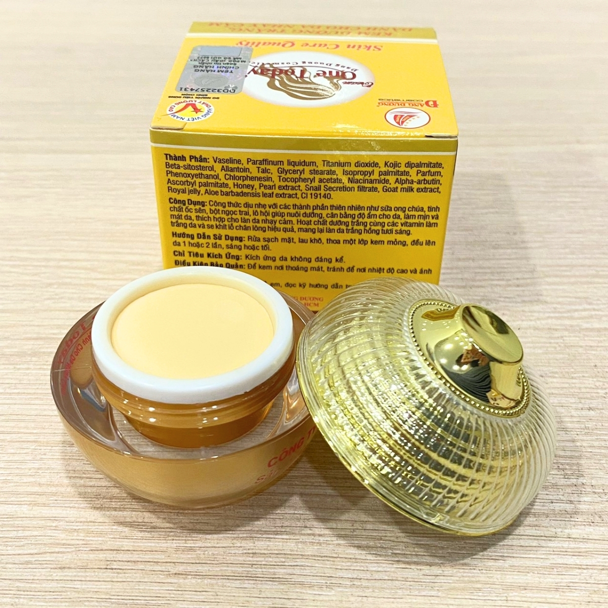 Vaseline, Paraffinum liquidum, Titanium dioxide, Kojic dipalmitate, Talc, Beta-sitosterol, Allantoin, Glyceryl stearate, Isopropyl palmitate, Parfum, Phenoxyethanol, Chlorphenesin, Tocopheryl acetate, Niacinamide, Alpha-arbutin, Ascorbyl palmitate, Honey, Pearl extract, Snail Secretion filtrate, Goat milk extract, Royal jelly, Aloe barbadensis leaf extract, CI 19140.