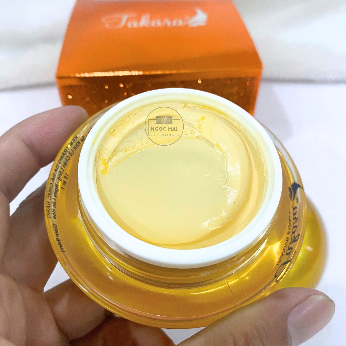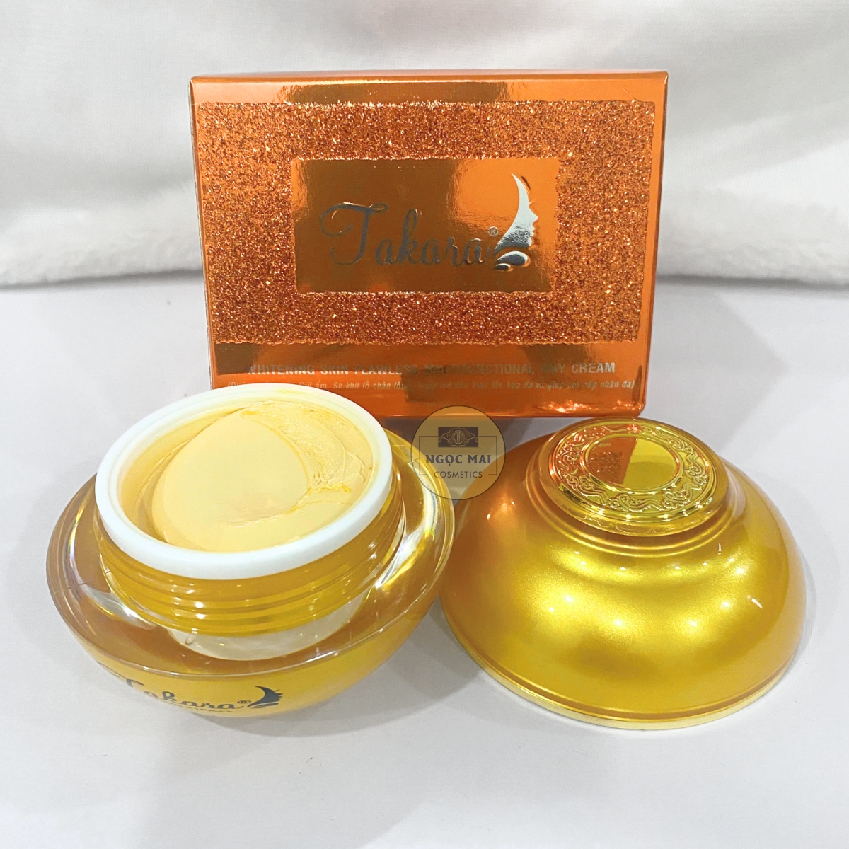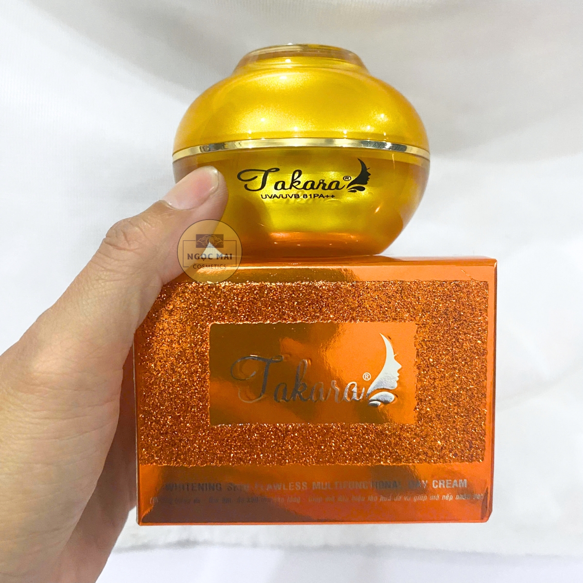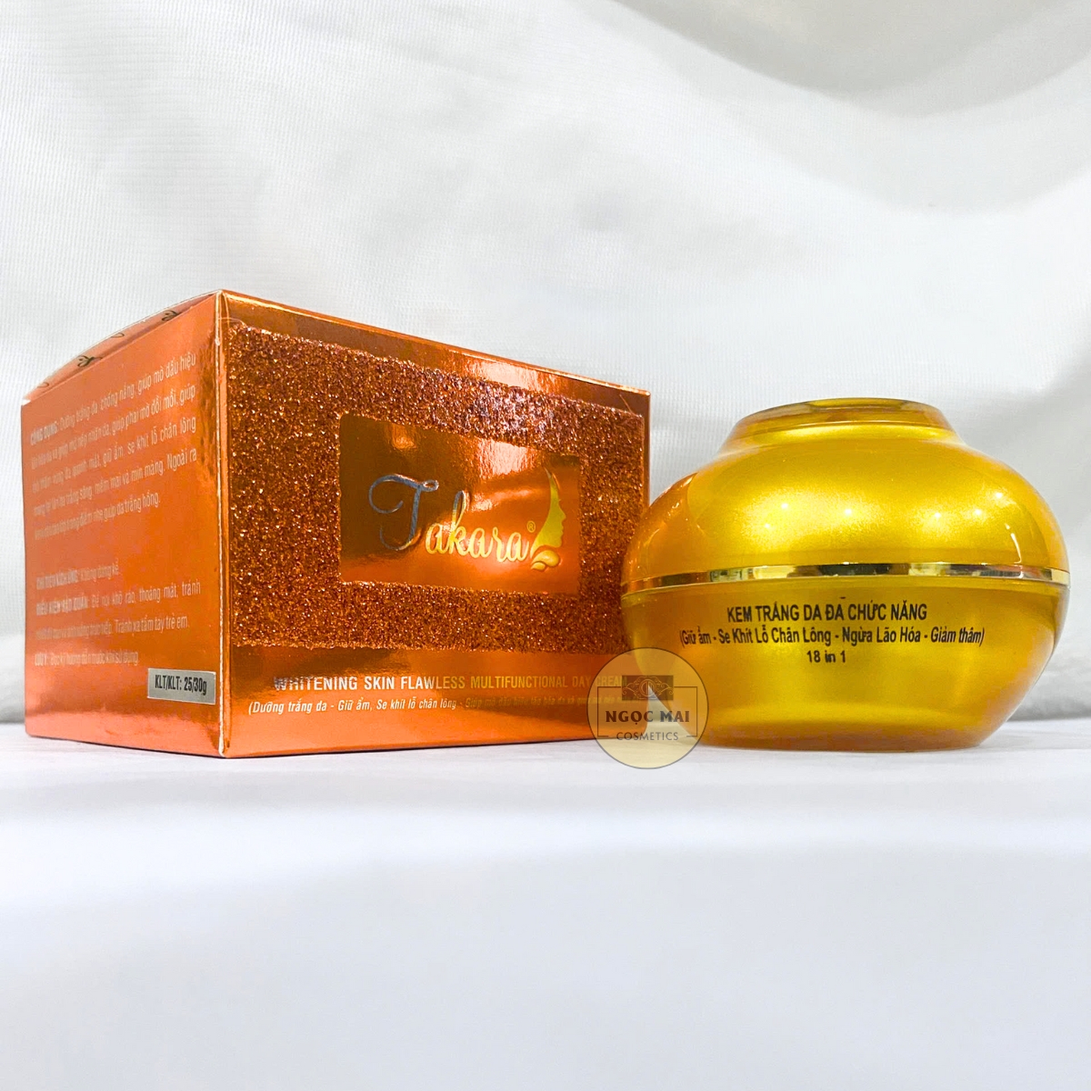 CÔNG DỤNG: Kem dưỡng trắng da đa chức năng 18 in 1 TAKARA được phối chế từ các loại thảo mộc thiên nhiên lành tính cho da nhạy cảm. Kem với các thành phần sát khuẩn hỡ trợ điều trị mụn, ngăn ngừa vi khuẩn gây mụn. Kết hợp với các thành phần làm mờ thâm nám, tàn nhang, đồi mồi một cách hiệu quả. Kem cung cấp nước giúp giữ ẩm cho da, làm săn chắc da và se khít lỗ chân lông. Ngăn ngừa lão hóa da. Kem có khả năng chống nắng tốt, có thể sử dụng thay cho kem chống nắng. Kích thích quá trình sản sinh ra collagen nuôi dưỡng và phục hồi da tổn thương đòng thời bảo vệ da khỏi tác nhân bên ngoài. Đem đến cho bạn một làn da trắng đep như mong đợi.