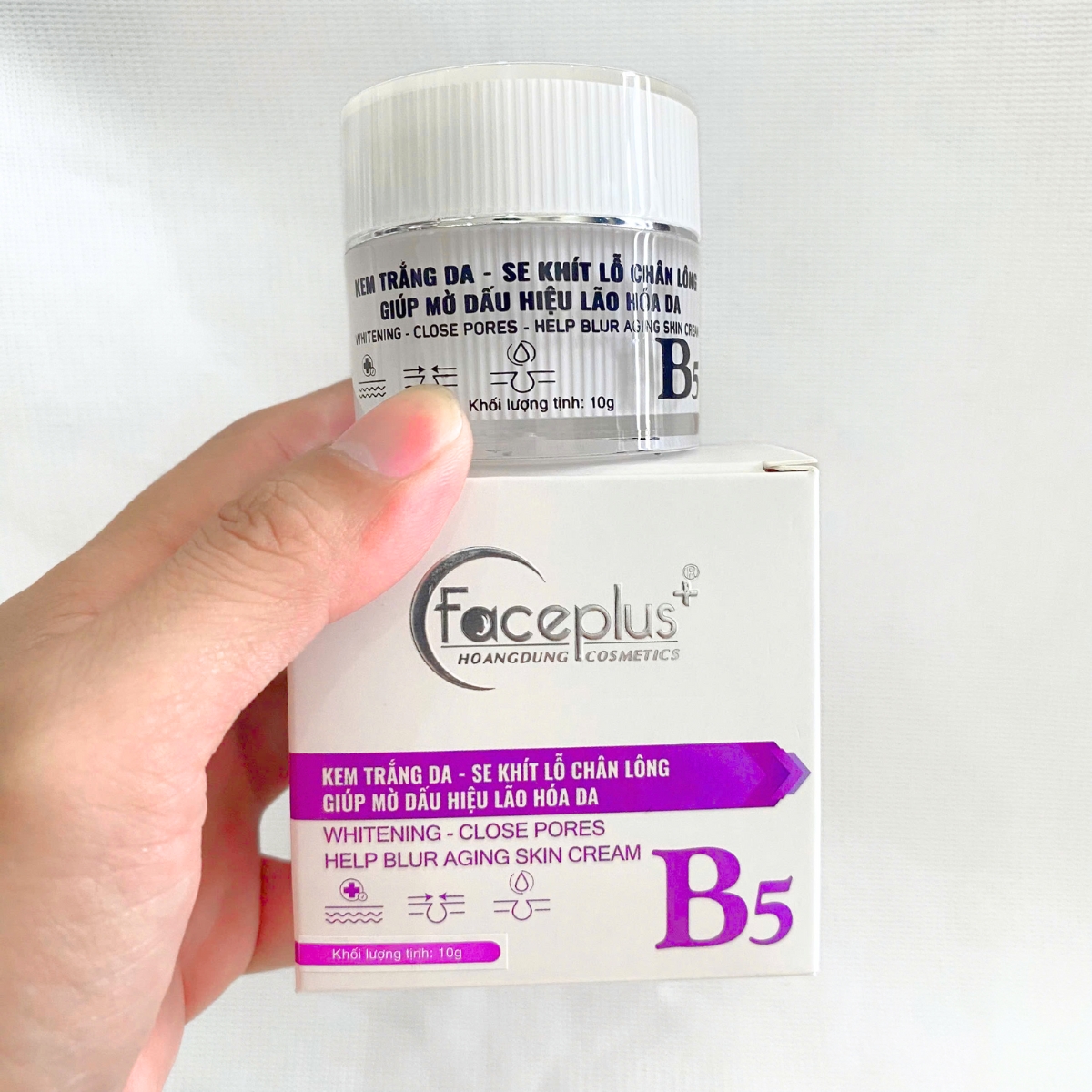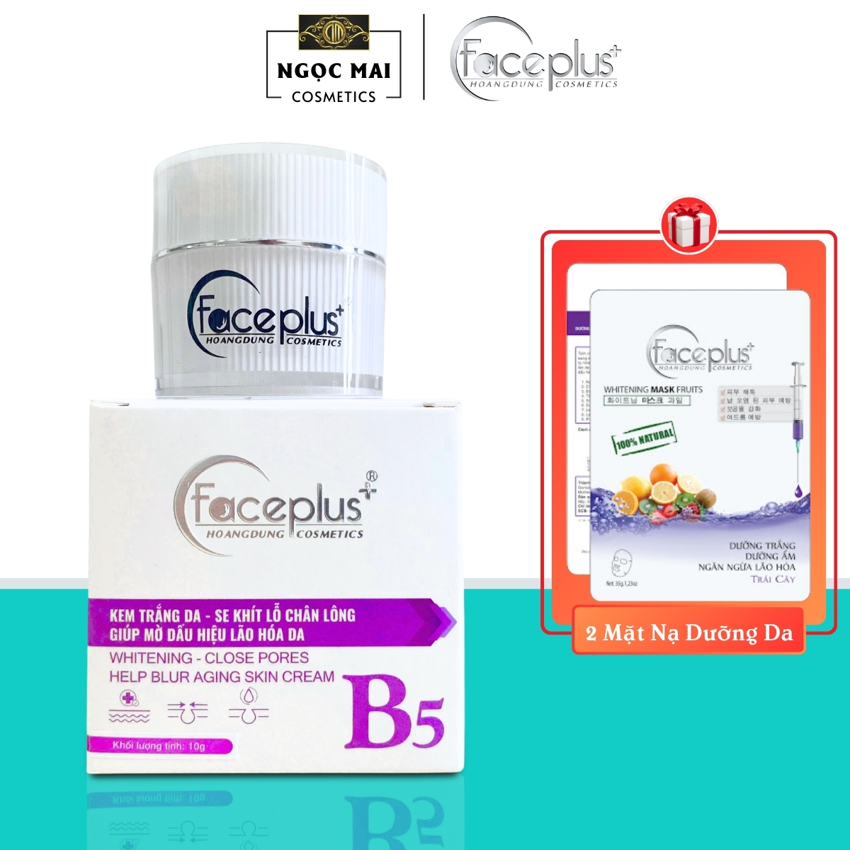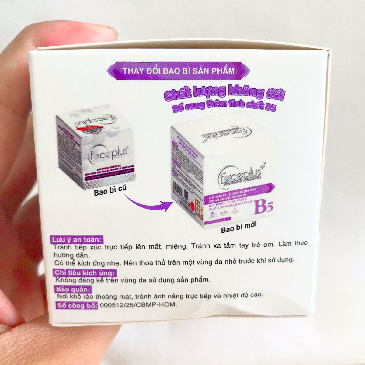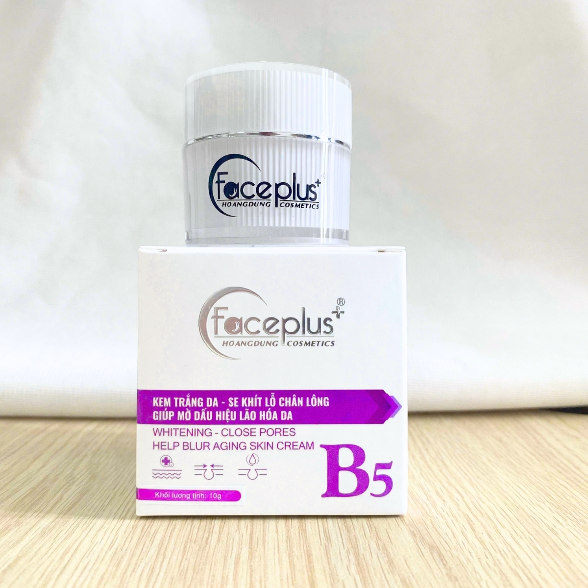 - Kem dưỡng trắng, làm mờ dấu hiệu lão hóa Faceplus B5 là sự kết hợp tinh tế giữa dưỡng trắng chuyên sâu và chống lão hóa hiệu quả, giúp làn da trở nên mịn màng, đều màu và căng bóng rạng rỡ. Công thức giàu hoạt chất dưỡng da tiên tiến như Niacinamide, Alpha-Arbutin, Kojic Dipalmitate, Vitamin C & E, cùng các acid tẩy nhẹ tự nhiên (AHA – BHA – PHA) mang đến hiệu quả chăm sóc toàn diện cho làn da phụ nữ hiện đại.