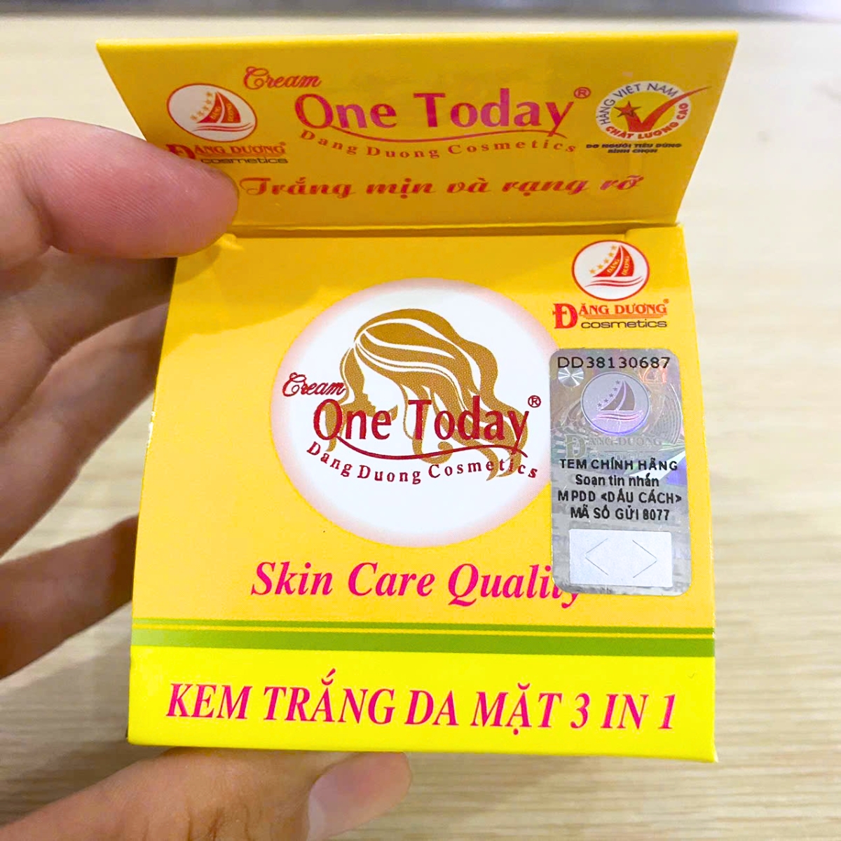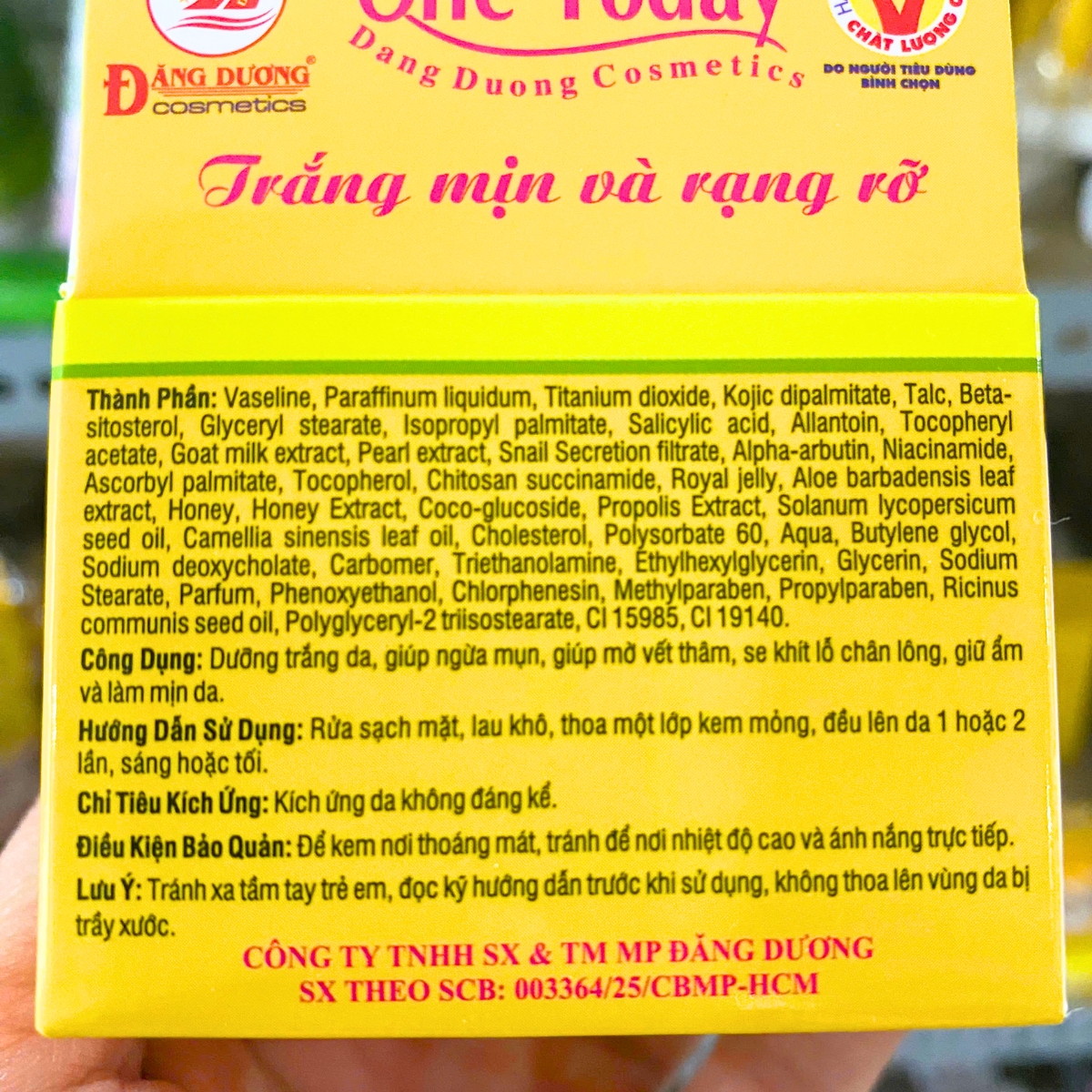 + Trên hộp có TEM CHỐNG HÀNG GIẢ (hình bầu dục) của Mỹ phẩm Đăng Dương ( Đăng Dương Cosmetics)