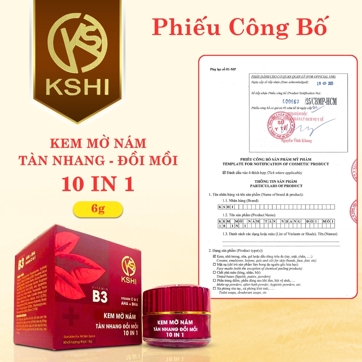 - Kem mờ nám KSHI là giải pháp dưỡng da đa tác động, kết hợp hoạt chất làm sáng hiện đại và chiết xuất thiên nhiên quý giá, giúp cải thiện rõ rệt tình trạng nám, tàn nhang, đồi mồi và ngăn ngừa hình thành sắc tố mới, mang lại làn da sáng mịn, rạng rỡ và tươi trẻ.