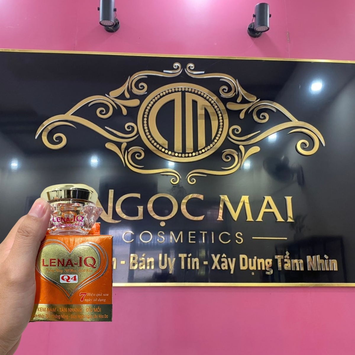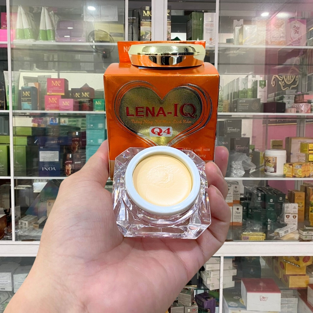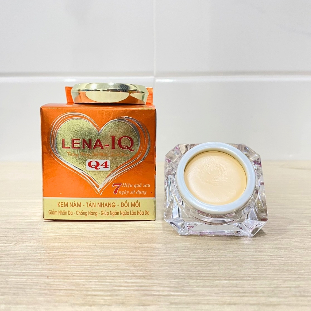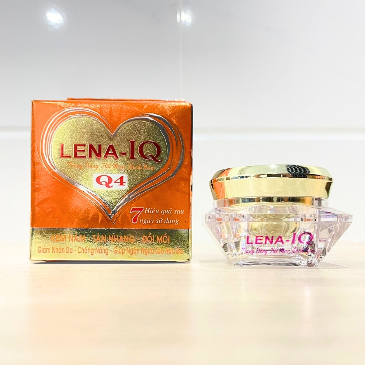 Công dụng: Kem trị nám - Tàn nhang - Đồi mồi - Giảm nhăn da - Chống nắng - Ngừa lão hóa Q4 LENA-IQ giúp làm mờ các vết nám da, sạm da, tàng nhang, đồi mồi. Kem còn ức chế hình thành sắc tố đen, giúp da đều màu, trắng mịn và hạn chế tác hại của ánh nắng mặt trời (UV), dưỡng ẩm, ngăn ngừa lão hóa da, giảm nếp nhăn giúp da luôn trẻ đẹp. Với thành phần thiên nhiên không gây khích ứng da kem LENA IQ hiện là sản phẩm ngừa nám, tàn nhang, đồi mồi hiệu quả nhất hiện nay.